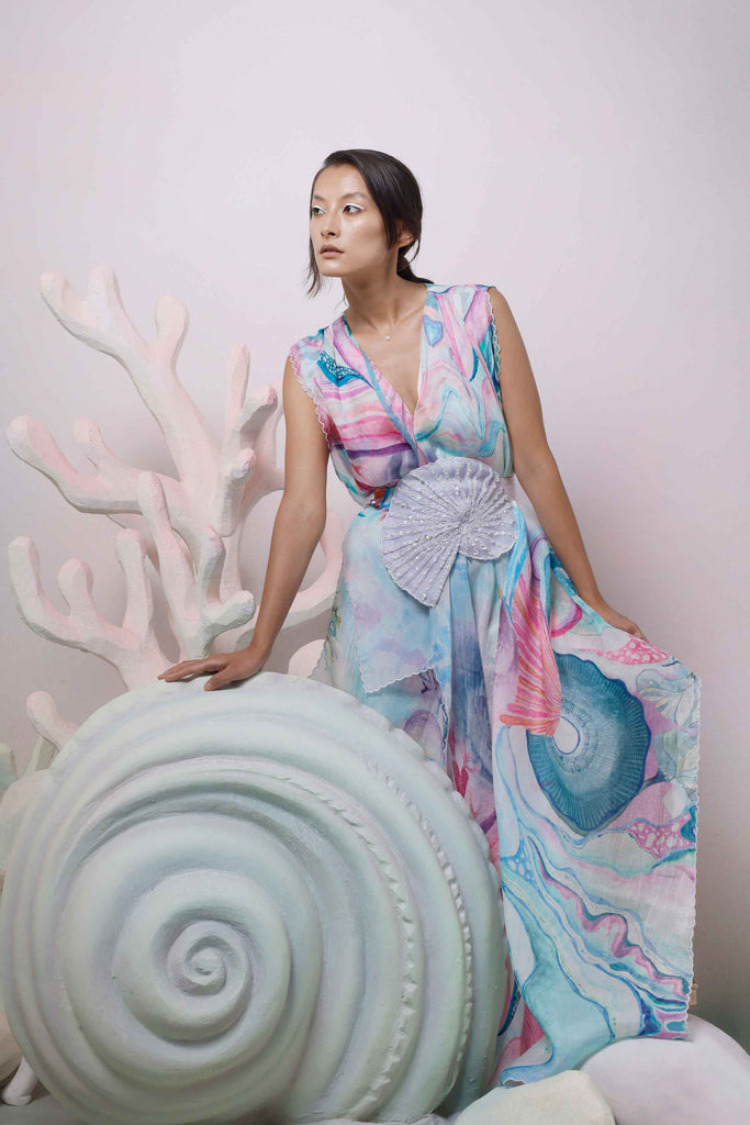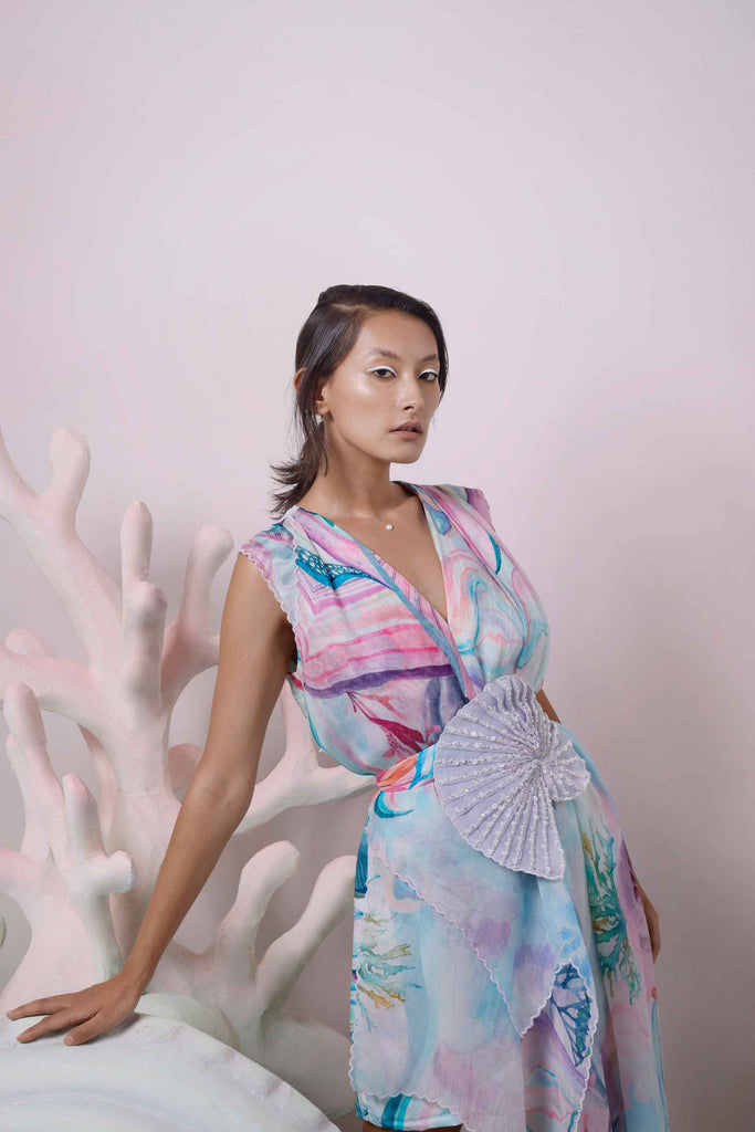 | Printed silk dress with organza panels and a 3D shell shaped belt. |