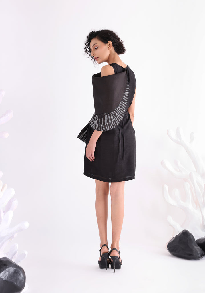 Straight dress with circle ruffle detailing and threadwork surface embroidery.