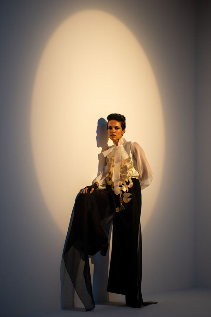 A pussy bow shirt with calligraphy cutwork gold overlay and a panel pant
