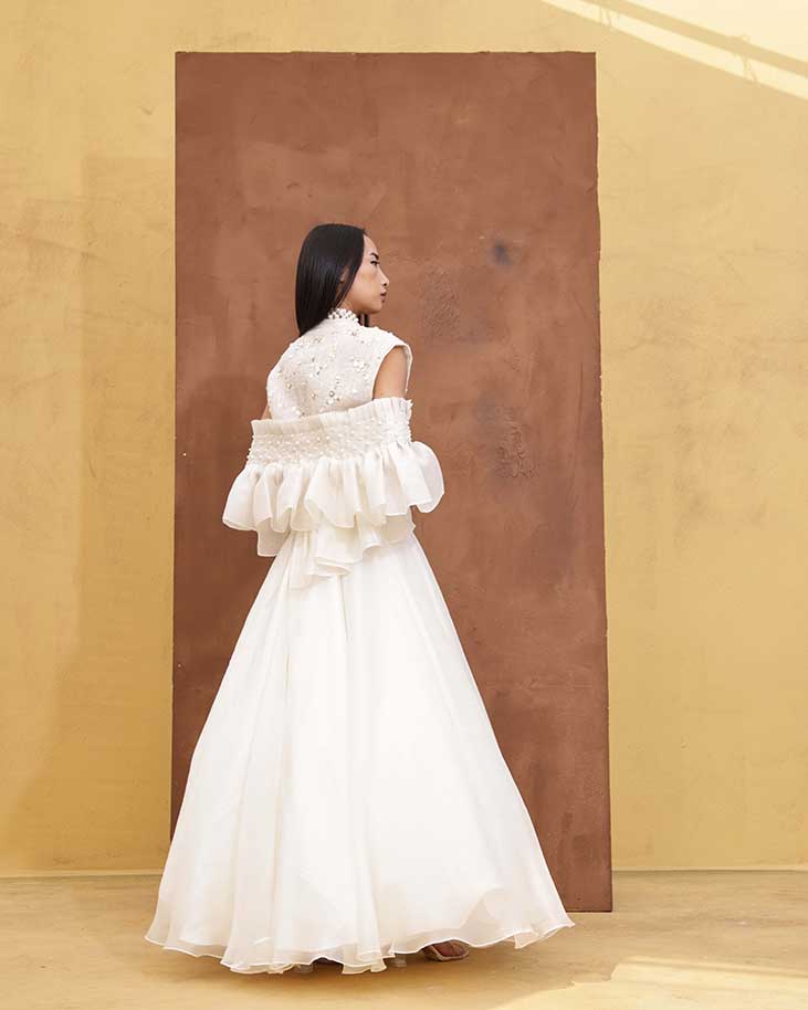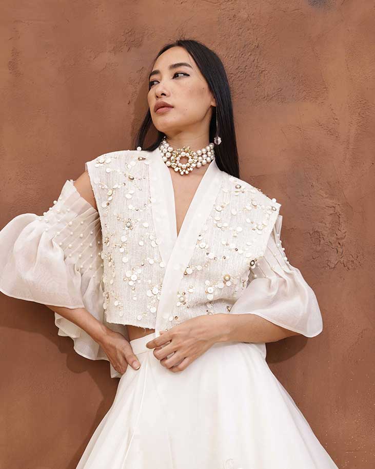 TEXTURED CHIRO TOP + SKIRT WITH EMBROIDERED APPLIQUE