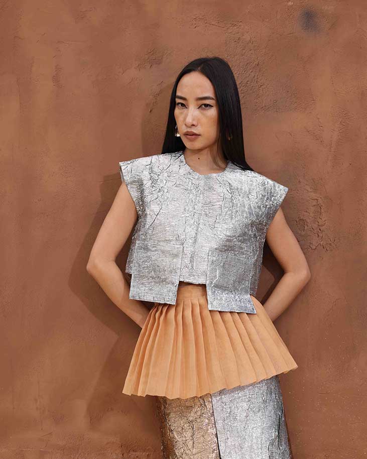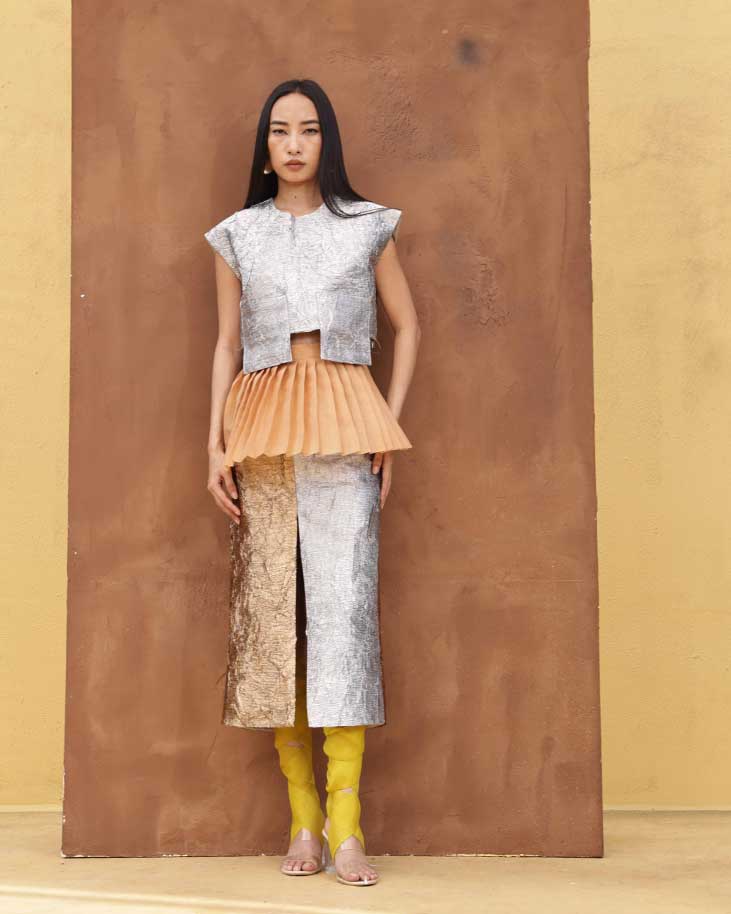 SILVER TISSUE BOXY TOP + ORGANZA PLEATED BELT + BRONZE SKIRT