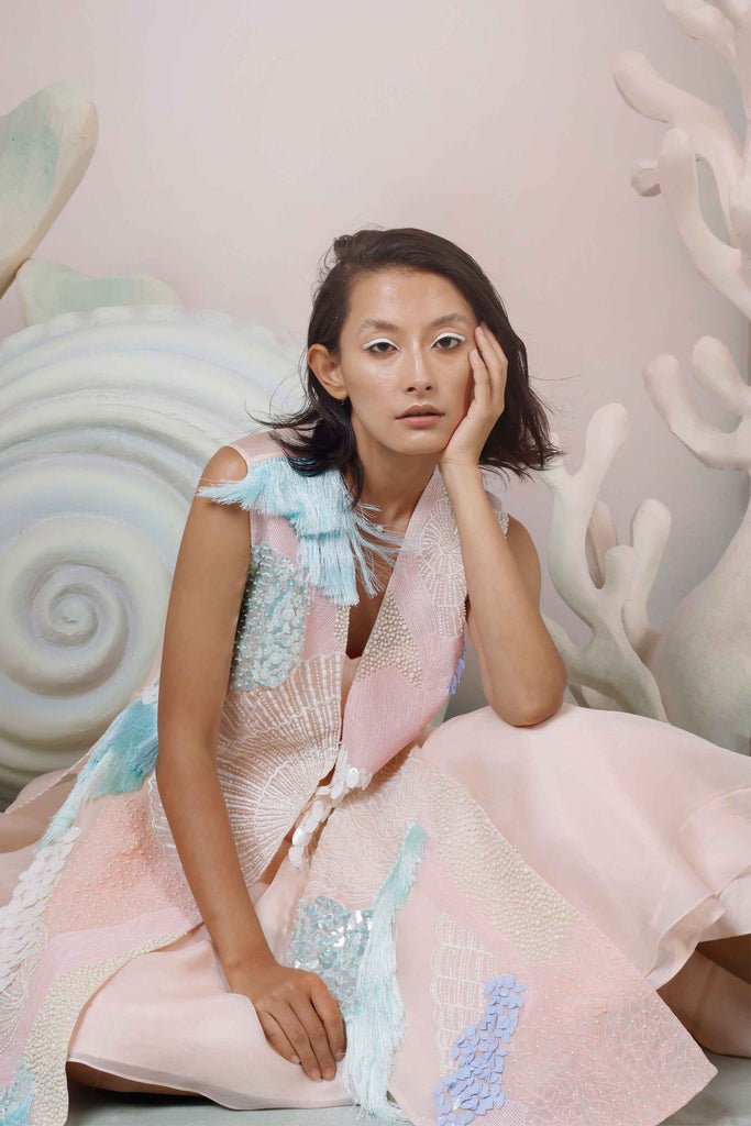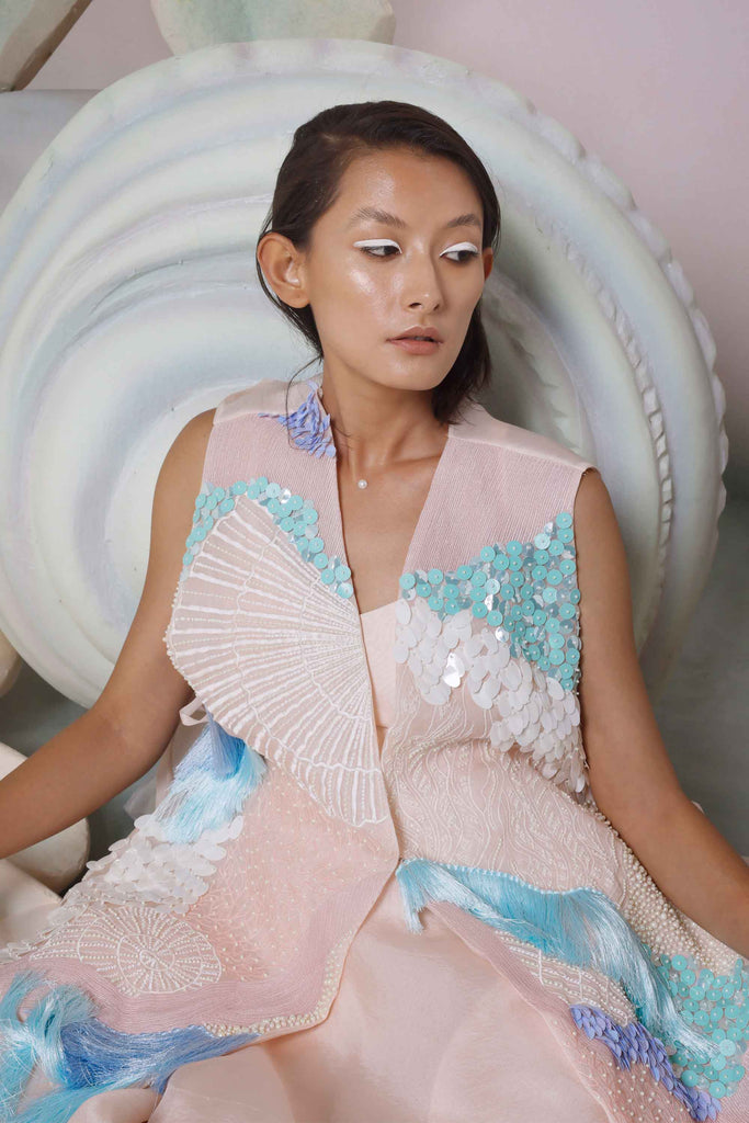 Embellished long jacket with organza mid length dress. Short gilet version with pants available. ₹29,000 |