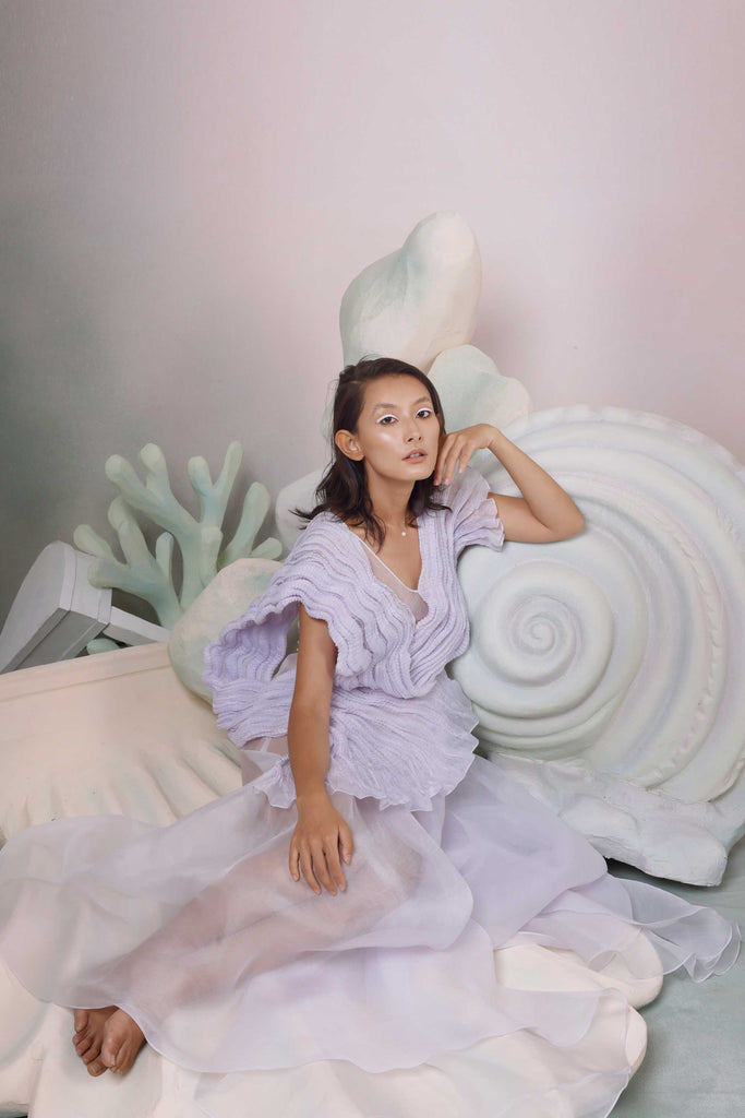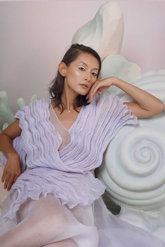 Lavender organza crushed wave sculpture draped sheer gown teamed with flared pants.