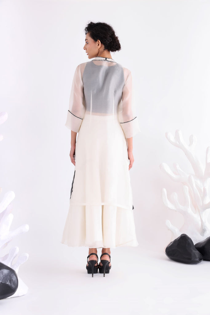 Organza A-line skirt, organza trench with thread work and applique detail and a spandex inner