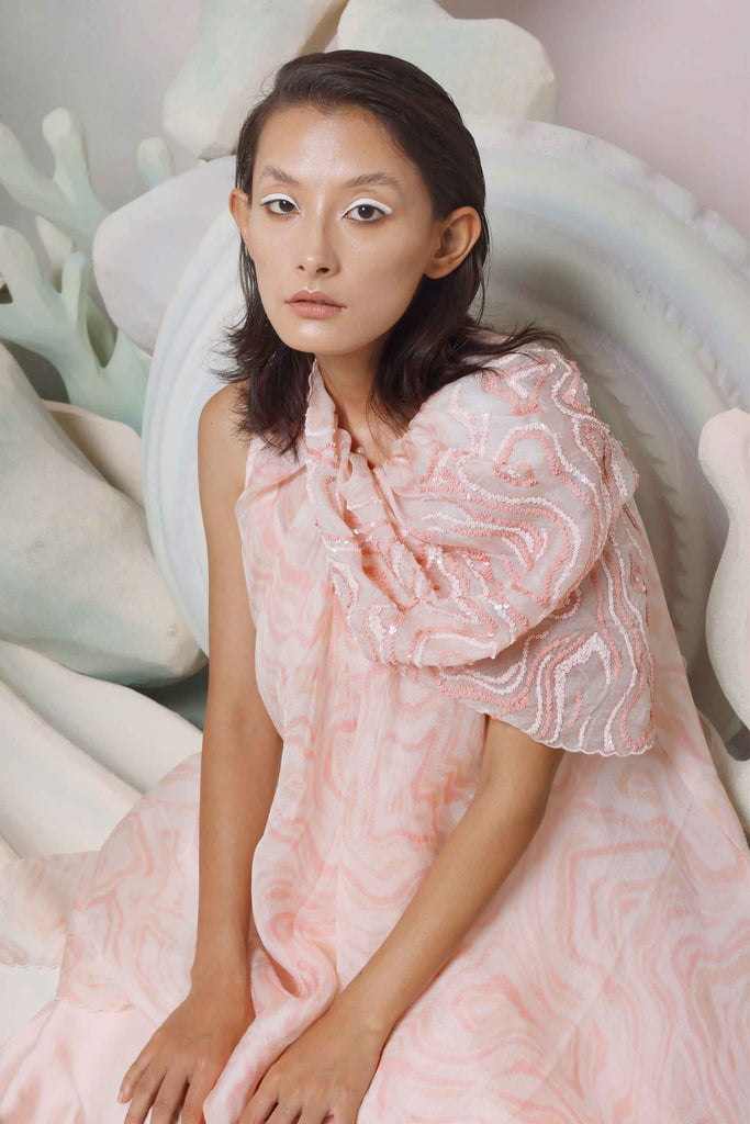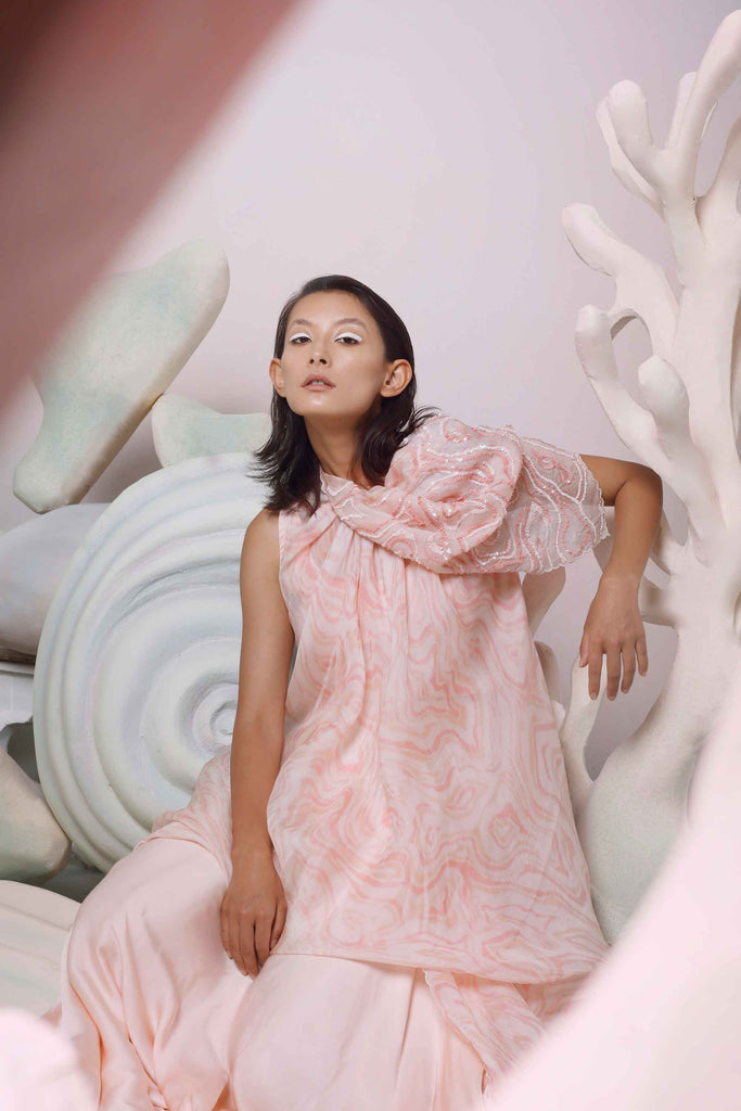 Pink waves printed organza draped top with a sequined embellished neck paired with a flared skirt