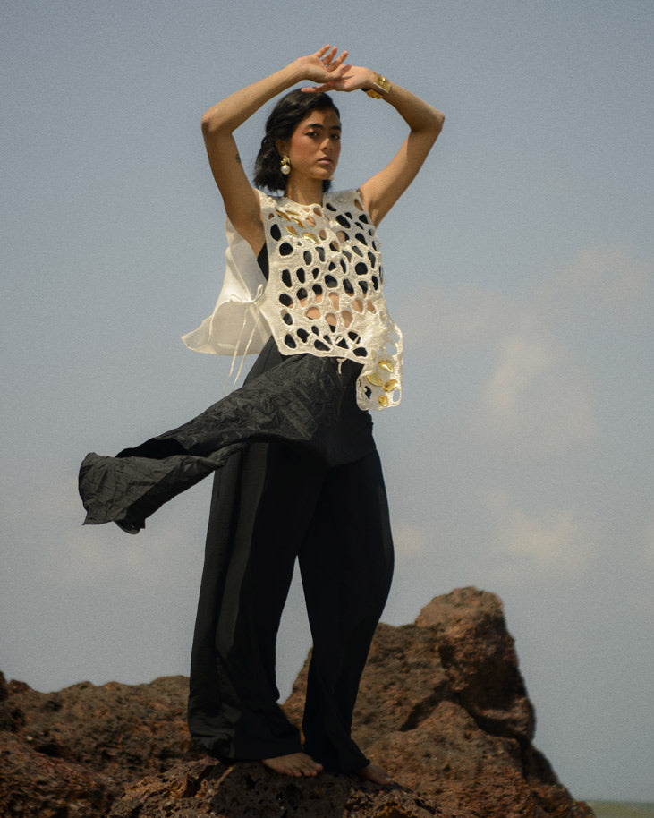 CUTWORK EMBROIDERED OVERLAY WITH GOLD BUTTONS, SCUBA INNER AND CILK CRUSHED DRAPE PANTS