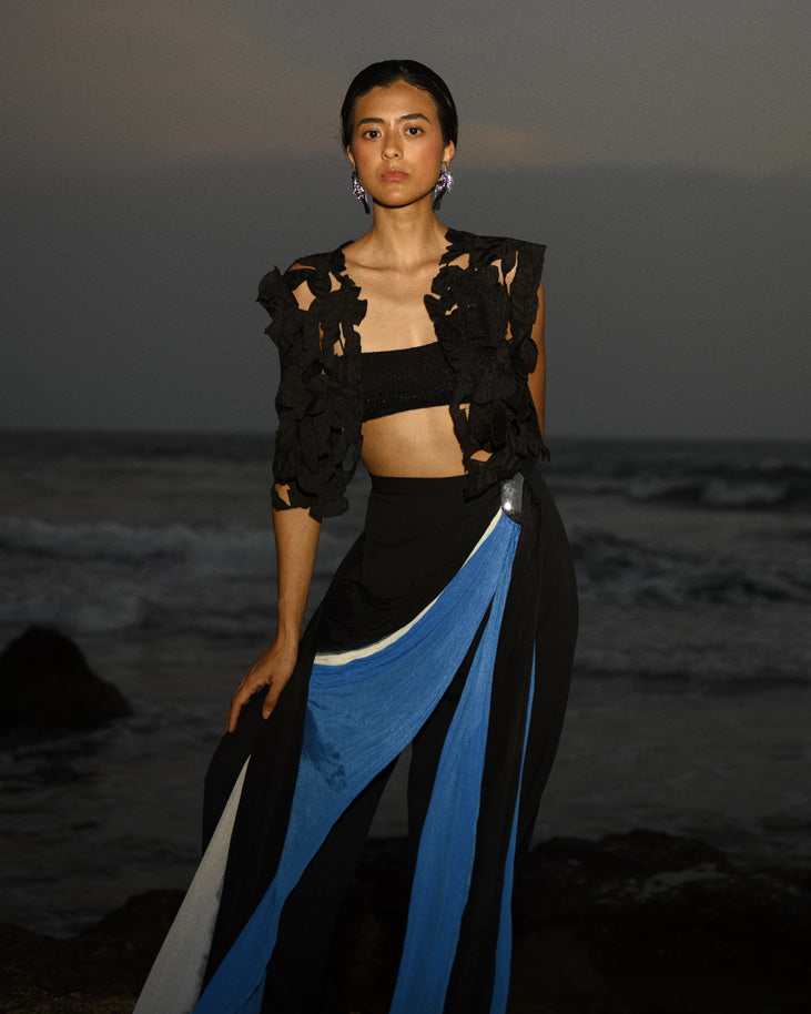 ORGANZA CUTWORK JACKET WITH EMBROIDERED BUSTIER AND RUCHED DRAPED PANTS