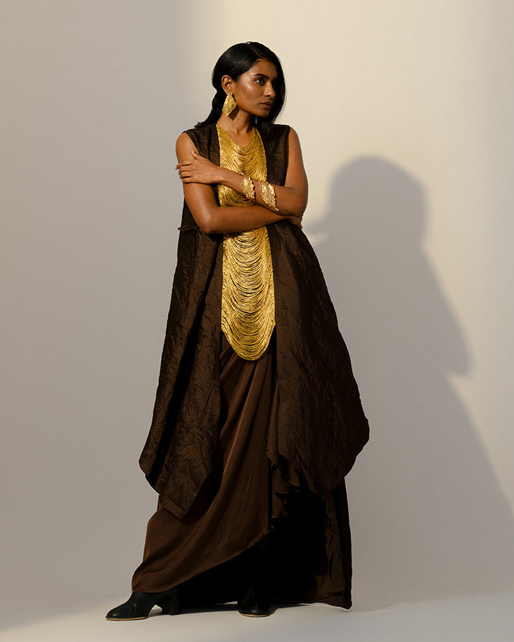 GOLD TASSLED CRUSHED OVERLAY WITH CRUSHED SLIP INNER AND MODAL SATIN DRAPE SKIRT