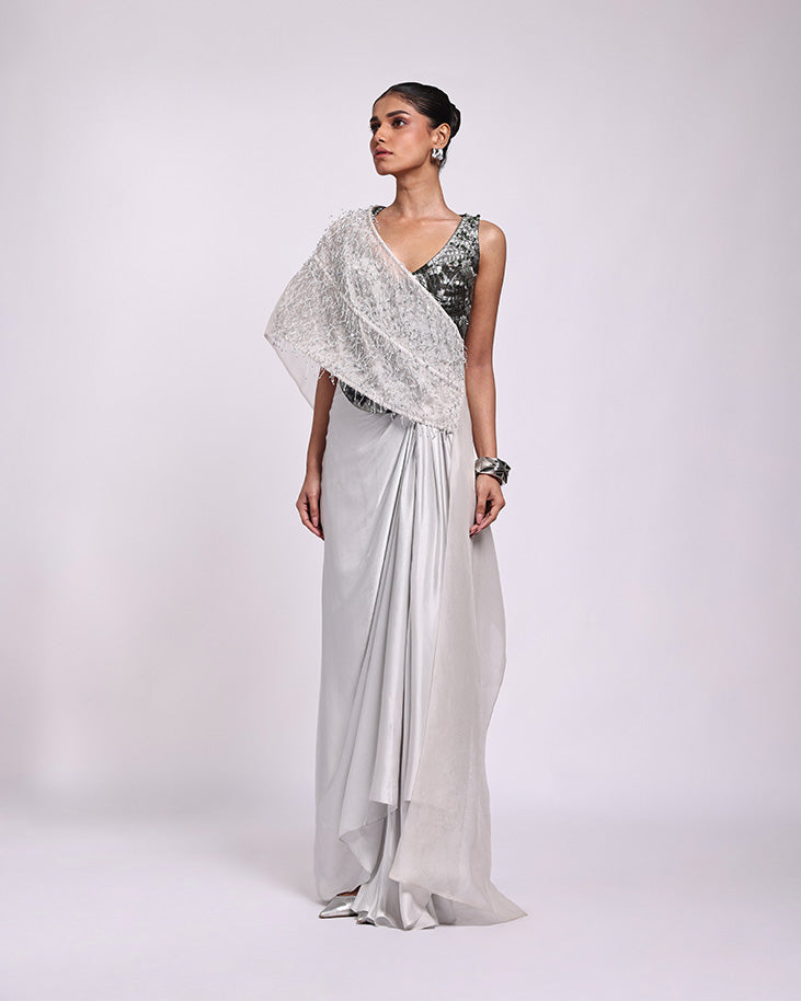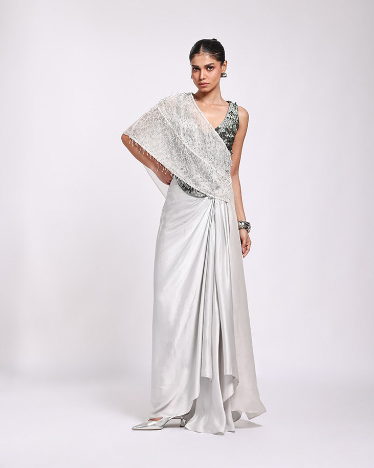 Hand embroidered structured drape + quilted top + old drape skirt