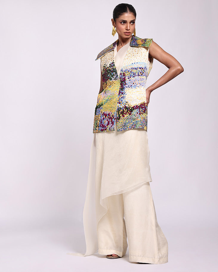 Printed jacket with hand embroidery + silk inner with drape and silk pants.